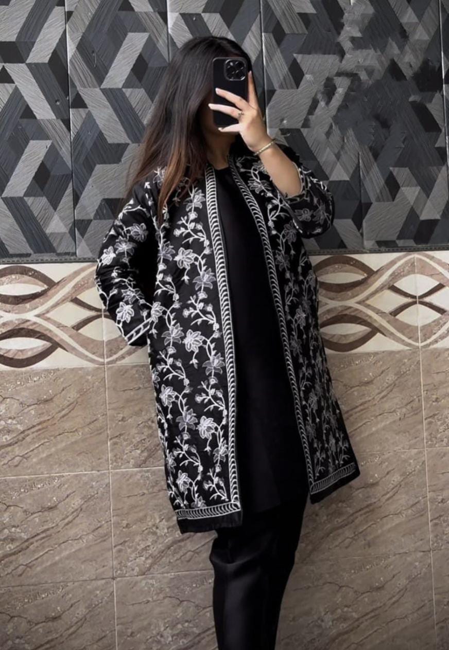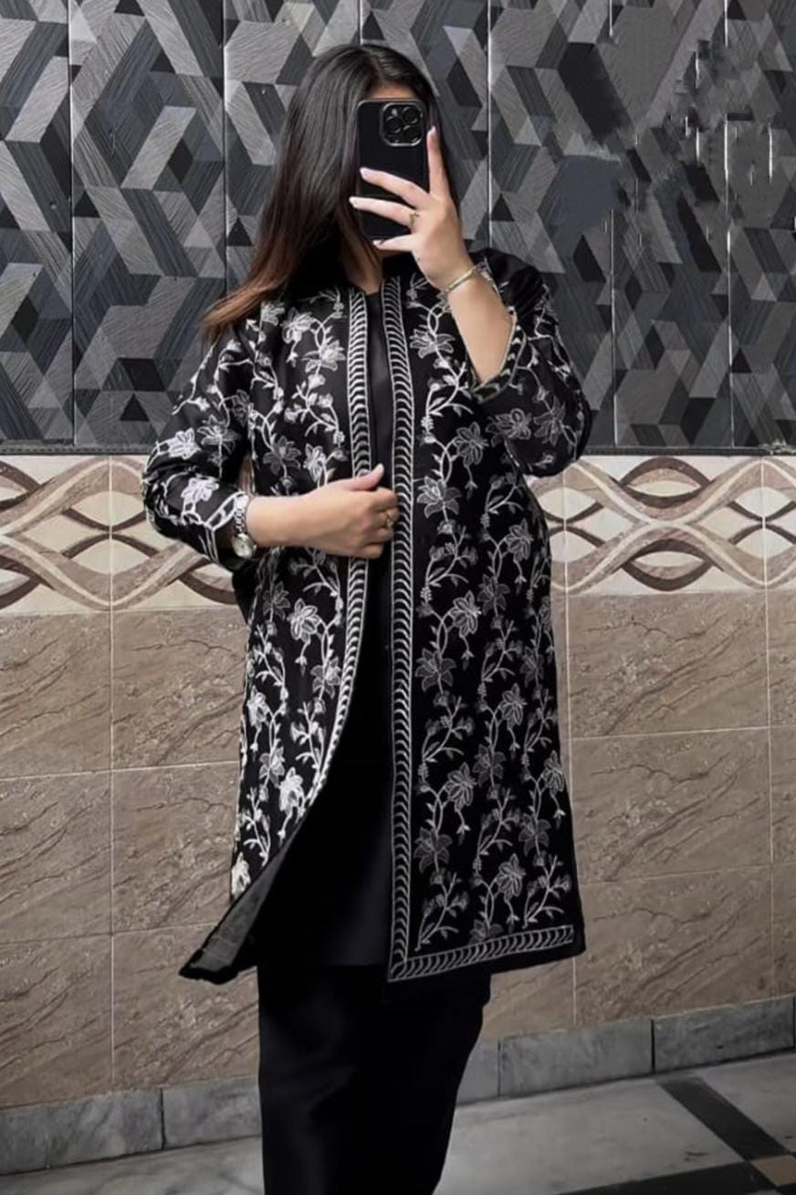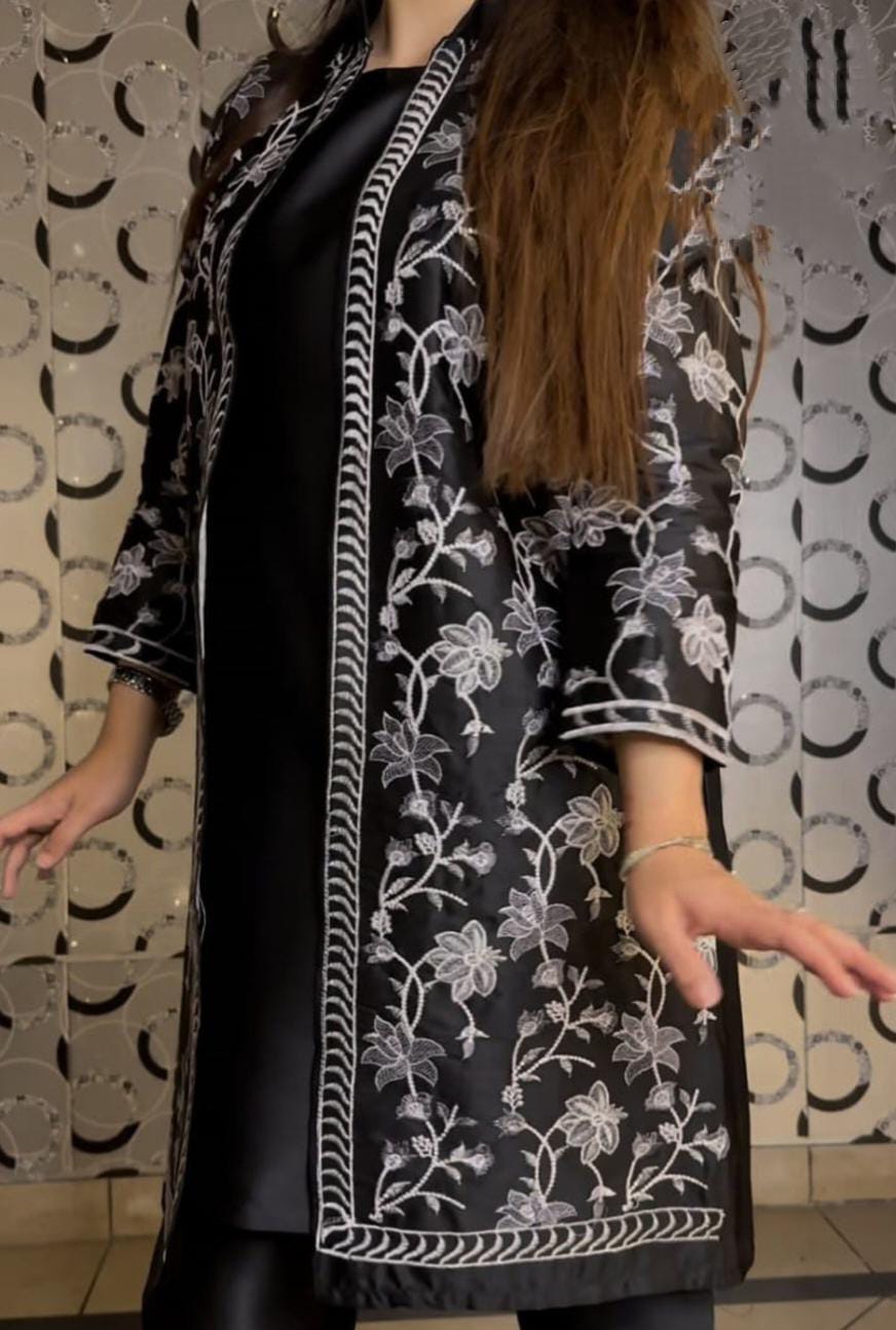 Front Full Heavy White/Grey Thread Embroidered Gown with Sleeveless Inner and Trouser